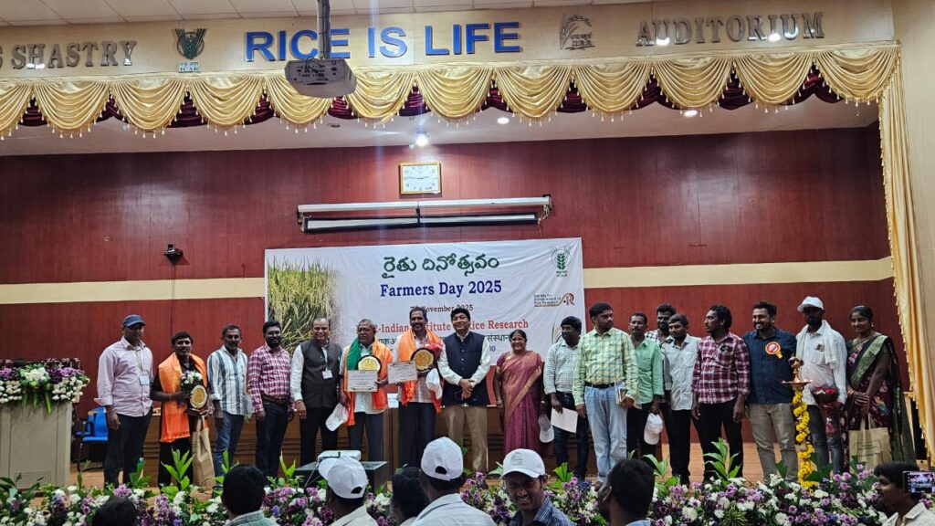 SAIRD KVK-Gaddipally participated in the Farmers’ Day Celebrations at ICAR-Indian Institute of Rice Research (IIRR), Rajendranagar on 07-11-2024. A. Kiran, SMS (Soil Science), and 25 DSR farmers attended the SBI–CSR funded event. Activities included a field visit on rice varieties, DSR cultivation, nutrient management, and pest management, with active farmer-scientist interactions. Dr. Shaik N. Meera (Director, ICAR-ATARI, Zone-X) inaugurated Exhibition Stalls showcasing rice varieties, innovations, mechanization, and DSR tech. A publication was released, and progressive farmers were honored. The event benefitted 315 farmers with insights on sustainable rice production. Officials included Dr. R.M. Sundaram (IIRR Director), Smt. M. Jayasree (NGO), Dr. R. Mahender Kumar (IIRR), Jaypal Reddy Solleti (FPO MD), and scientists from KVKs Gaddipally, Kampasagr, Kothagudem, and Wyra. Exposure to cutting-edge technologies was provided.