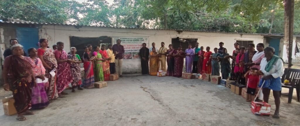 KVK, Gaddipally, conducted a training program on Good Agricultural Management Practices in Rabi vegetable crops and distributed critical inputs to Scheduled Caste and Scheduled Tribe farmers. The program focused on reducing chemical fertilizer and pesticide usage to obtain quality yields. Essential products such as chilli, tomato, and brinjal seedlings, solar light traps, neem oil, and PPE kits were provided to the farmers.