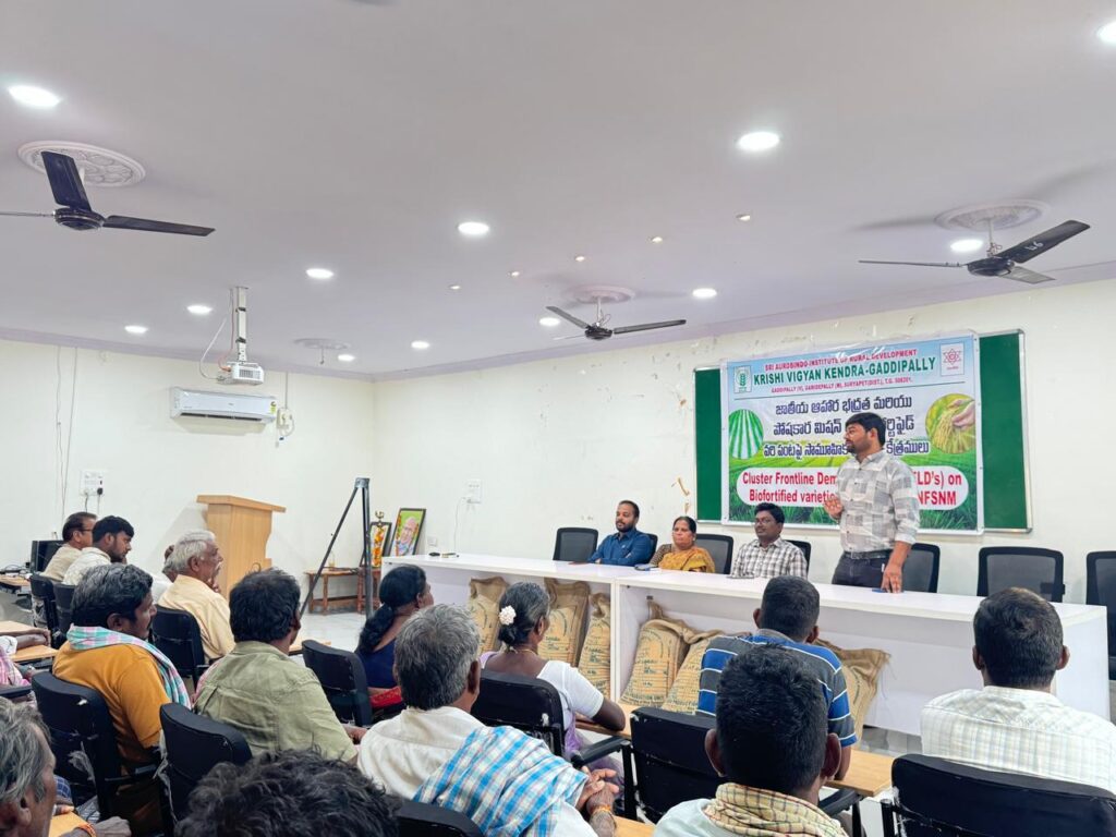KVK Gaddipally organized a Training-cum-Input Distribution Programme on Biofortified Rice under NFSNM on December 8, 2025. The event saw participation of 35 farmers, who received biofortified paddy seed DRR-48 (Dhan-48). A. Kiran, SMS (Soil Science), highlighted that DRR-48 is a fine-grained, 135-140 day variety containing 23.3 ppm zinc, with a low glycemic index, developed by IIRR, Rajendranagar. This variety possesses blast resistance, helping farmers improve yield and income. Farmers received awareness on pest and disease management, fertilizer and water management, and recommended cultivation practices. The use of biofortified rice aims to address nutritional deficiencies in rural areas, promoting healthier food options. The staff involved in the programme were A.Kiran, SMS-(Soil Science), Ch.Naresh, SMS-(Horticulture), D.Adarsh, SMS-(Plant Protection), and N.Sugandhi, P.A (Home Science). The event was a success, with farmers gaining valuable insights and resources to enhance their agricultural practices.